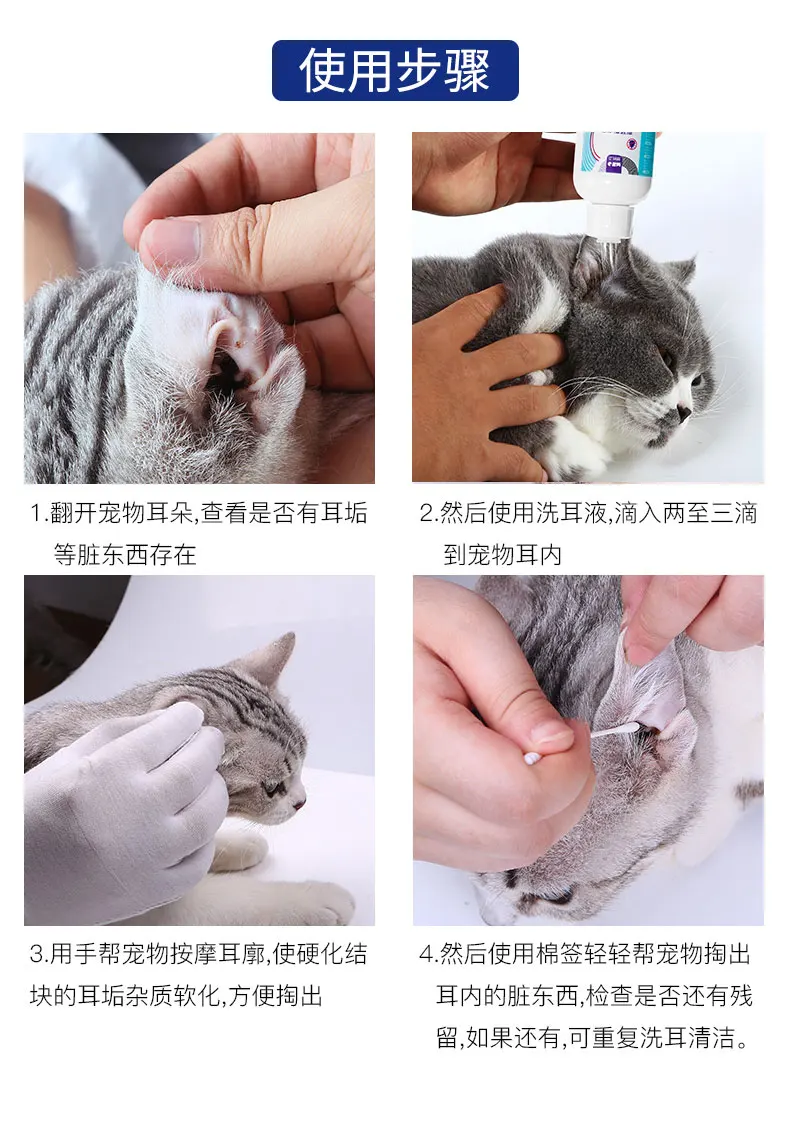 4. Pour the product on a cotton ball and clean around the ear once a day. After opening, it is recommended to use continuously and use up as much as possible.